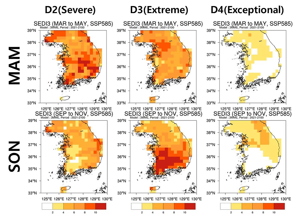 가뭄지수의 강도는 D0~D4로 분류하며, 고탄소 시나리오에서 봄철에는 D2(심각한 가뭄)가 남부지역에서, D3(극심한 가뭄)는 서울·경기 지역에서 더 빈번하며, 가을철에는 D3(극심한 가뭄)가 남부지역에서 매우 빈번할 것으로 전망되었다. 현재에는 거의 발생하지 않는 D4(이례적으로 극심한 가뭄, 5% 이하 수준의 발생)는 봄/가을철 모두 남부보다는 중·북부지역에서 발생할 것으로 전망되었다.