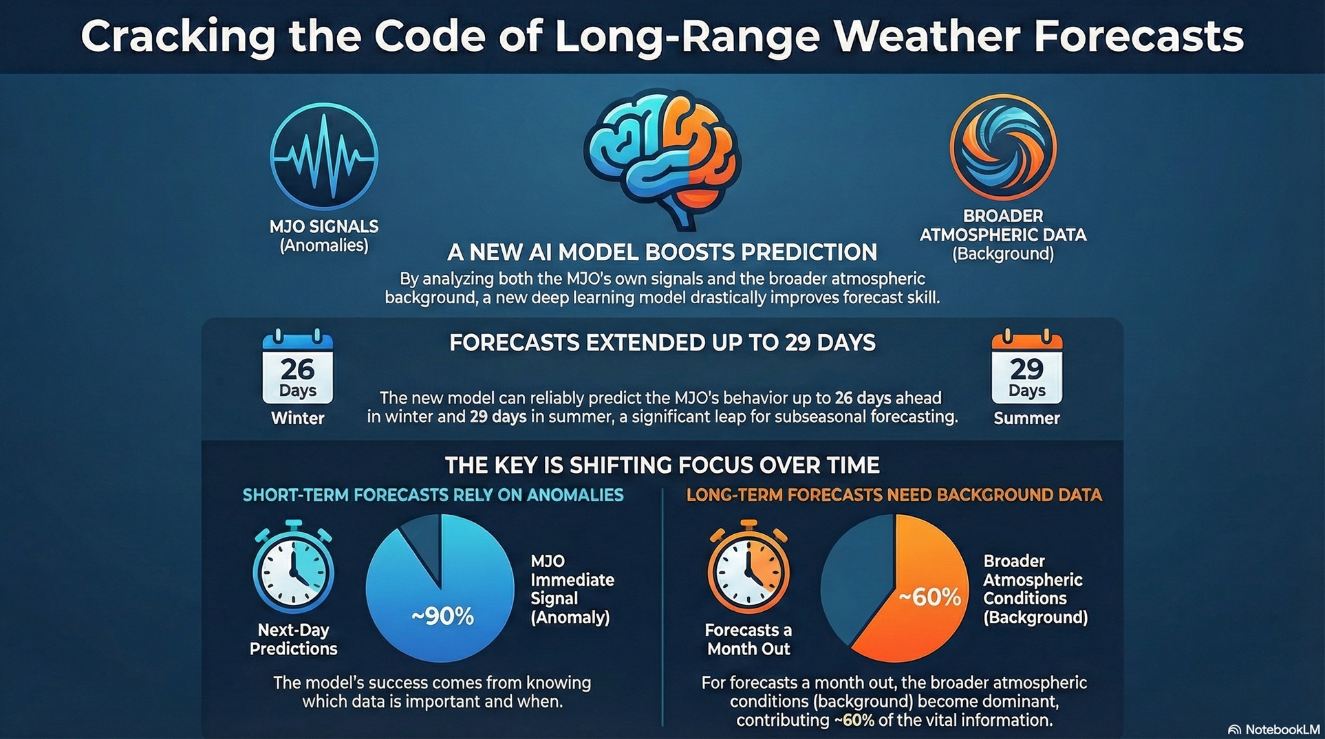 The MJO is a massive convective system that propagates through the tropics, often triggering extreme weather events such as hurricanes and floods across the globe. While existing AI models primarily focused on isolated MJO signals, this new research introduces a "multi-scale decomposition" approach. By teaching the AI to analyze both the MJO signals and the underlying "background climate conditions"—such as seasonal and interannual variations—the model provides a more comprehensive view of the atmosphere.