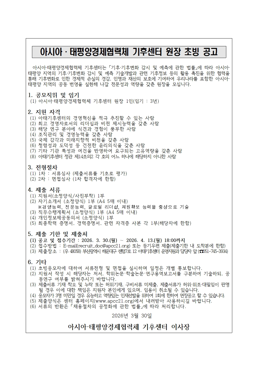 아시아·태평양경제협력체 기후센터 원장 초빙 공고