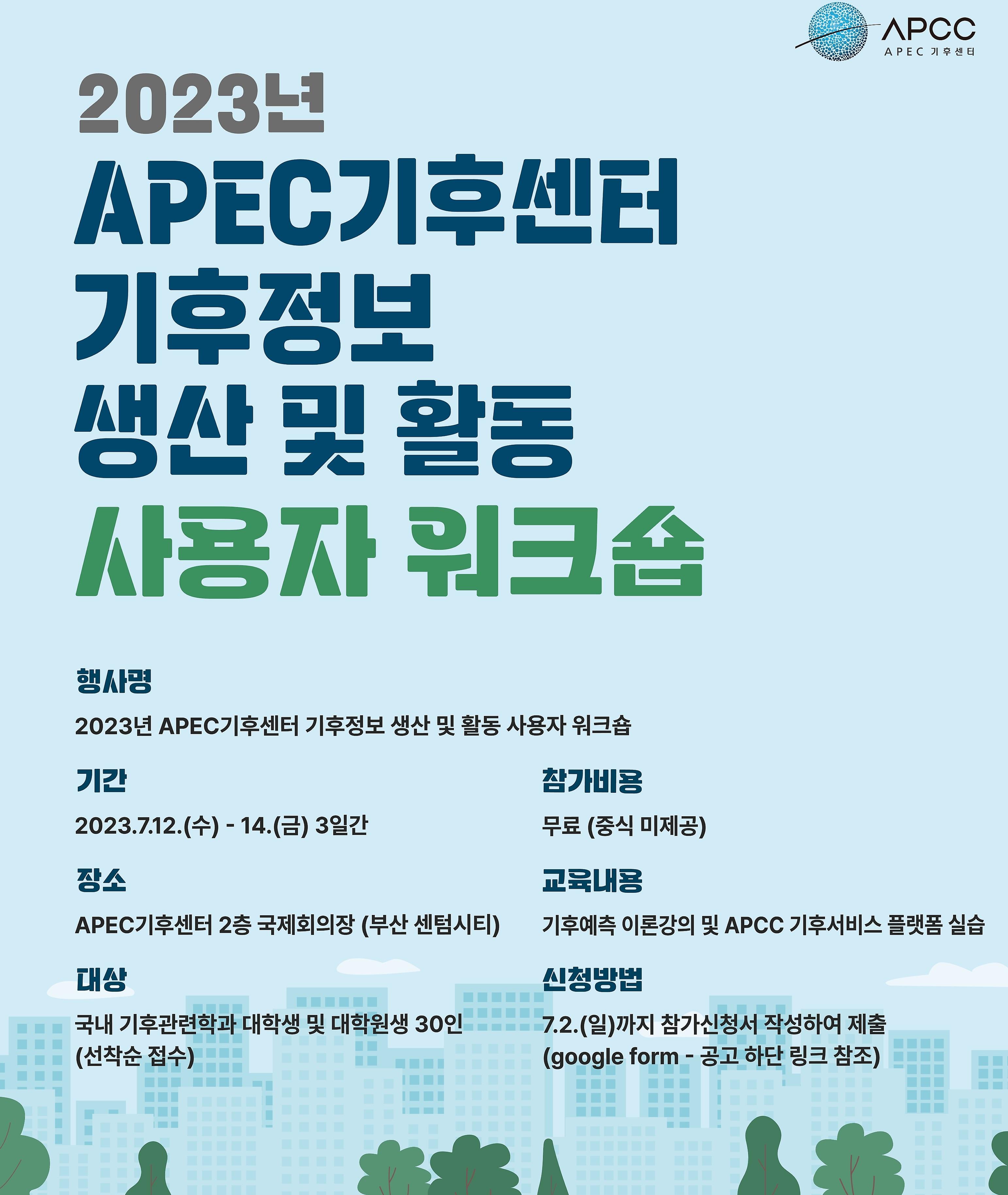 APEC기후센터(APCC)는 2023년 7월 12일(수)부터 14일(금)까지 3일간 국내 기후·환경 관련학과의 대학생 및 대학원생 15명이 참가한 가운데 “2023년도 APEC기후센터(APCC) 기후정보 생산∙활용 사용자 워크숍(이하 사용자 워크숍)”을 부산 해운대에 있는 APEC기후센터 내 국제회의장에서 개최하였다.