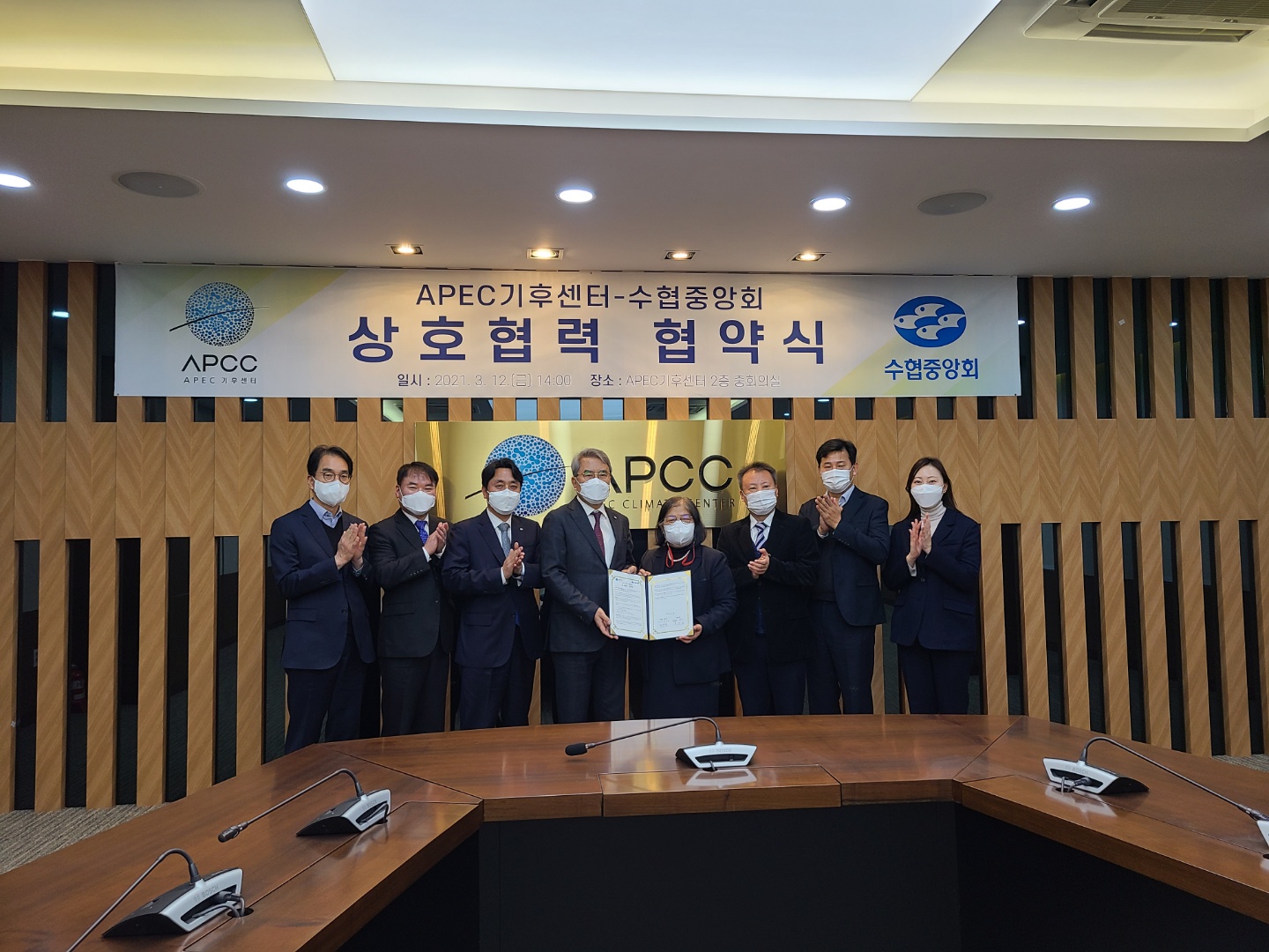 APEC기후센터와 수협중앙회는 지난 2021년 3월 12일(금) 부산 해운대의 APEC기후센터 중회의실에서 ‘기후예측정보의 수산업 부문 활용 지원을 위한 업무협약(MOU)’을 체결하였다.