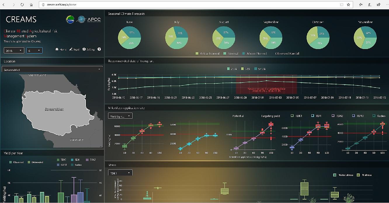 이를 위해 APEC기후센터를 포함한 국제공동연구팀은 맞춤형 기후정보 서비스를 위한 모바일 기반의 반응형 웹서비스인 ‘크림스(CREAMS, http://creams.nafri.org.la/home )개발하였다. 크림스(CREAMS)를 통한 작물모델을 활용함으로써 신뢰성 있는 쌀 생산량의 전망이 가능하여 이상기후 발생과 갑작스러운 기후의 변동에 대해 농업분야에서의 위험관리가 가능하도록 하였다.