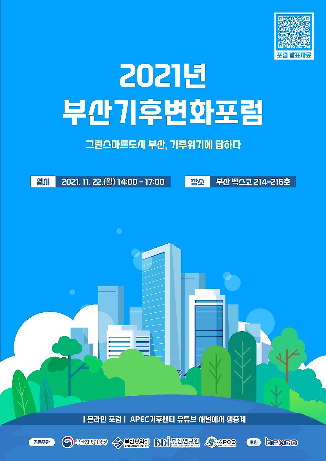 APEC기후센터(APCC)가 참여하고 있는 부산기후변화협의체는 기후위기 대응을 위한 기후변화 관련 과학·정책의 공유 도모와 부산지역 탄소중립의 실현을 위한 소통의 장을 마련하고자 2021년 11월 22일(월) 부산 해운대 벡스코에서 ‘2021년 부산 기후변화 포럼’을 개최하였다.