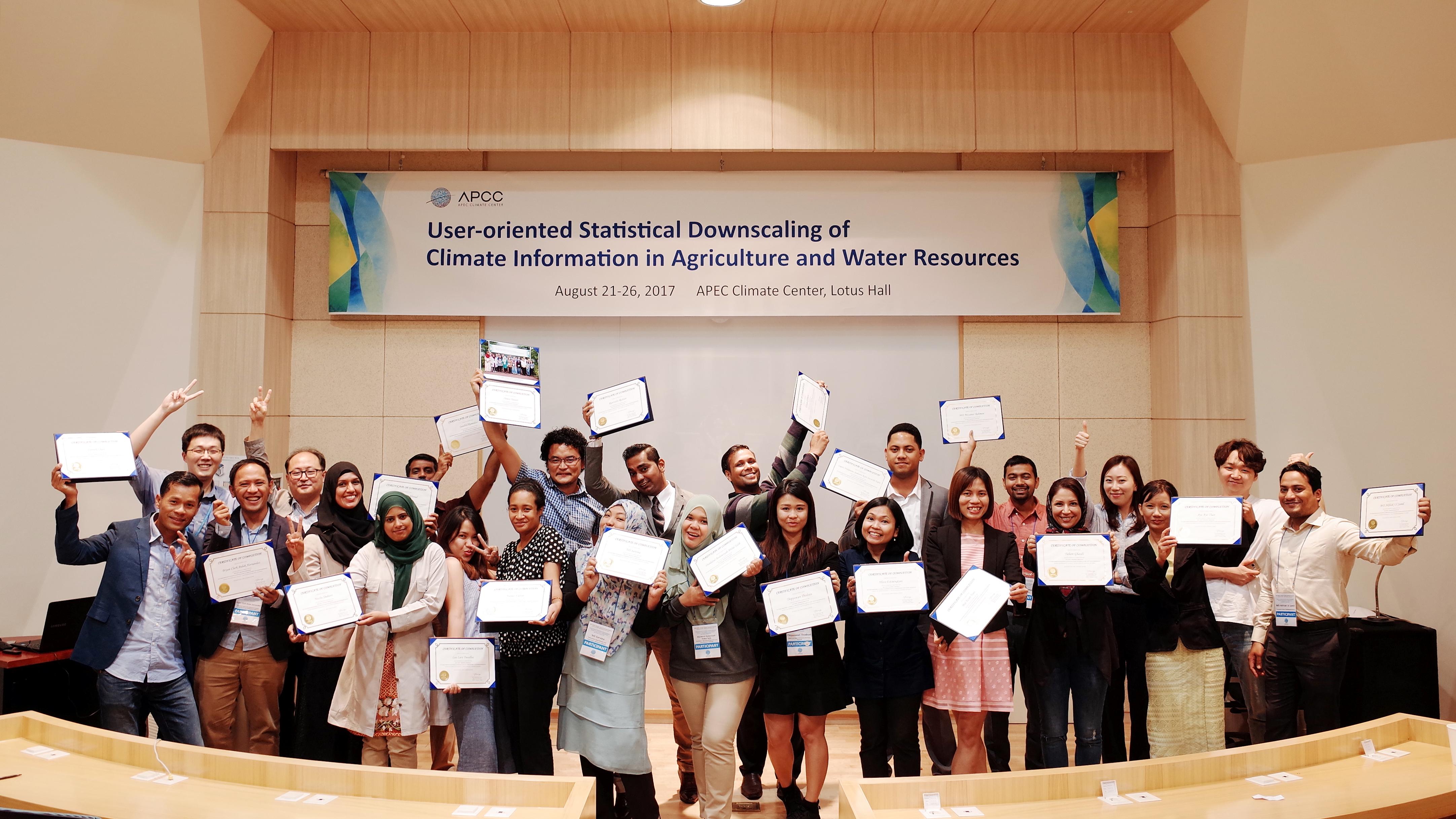 APEC기후센터는 2017년 8월 21일(월)부터 8월 26일(토)까지 6일간 부산 해운대의 센터 본관 내 국제회의장에서 아시아·태평양 지역(이하 아·태지역) 16개 개도국의 기상청 및 농업·수자원 분야 정부기관 실무진 20명을 대상으로 ‘2017년도 농업·수자원 분야 사용자 맞춤형 기후정보 생산 교육 프로그램’을 실시했다.
