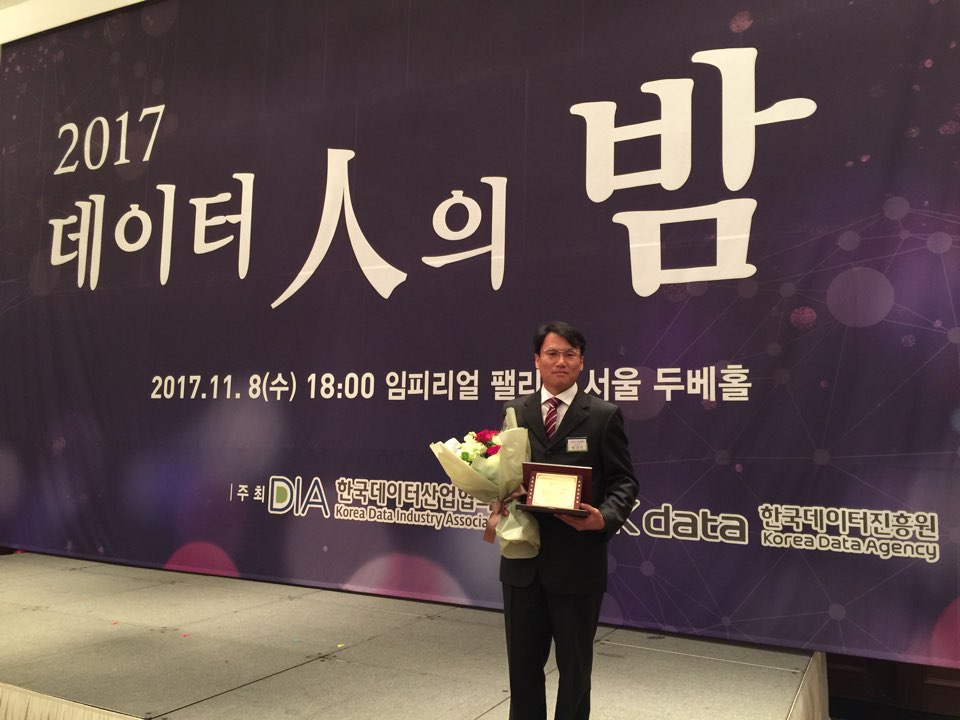 정보서비스팀의 한정민 선임연구원이 2017년 11월 8일(수)에 과학기술정보통신부(장관 유영민)와 한국데이터진흥원(원장 이영덕)이 개최한 ‘2017년도 대한민국 데이터 품질 대상’ 시상식에서 기후데이터 처리·활용의 저변확대를 통해 국내 *데이터의 품질을 높이는데 기여한 성과로 ‘개인상’을 수상하였다.