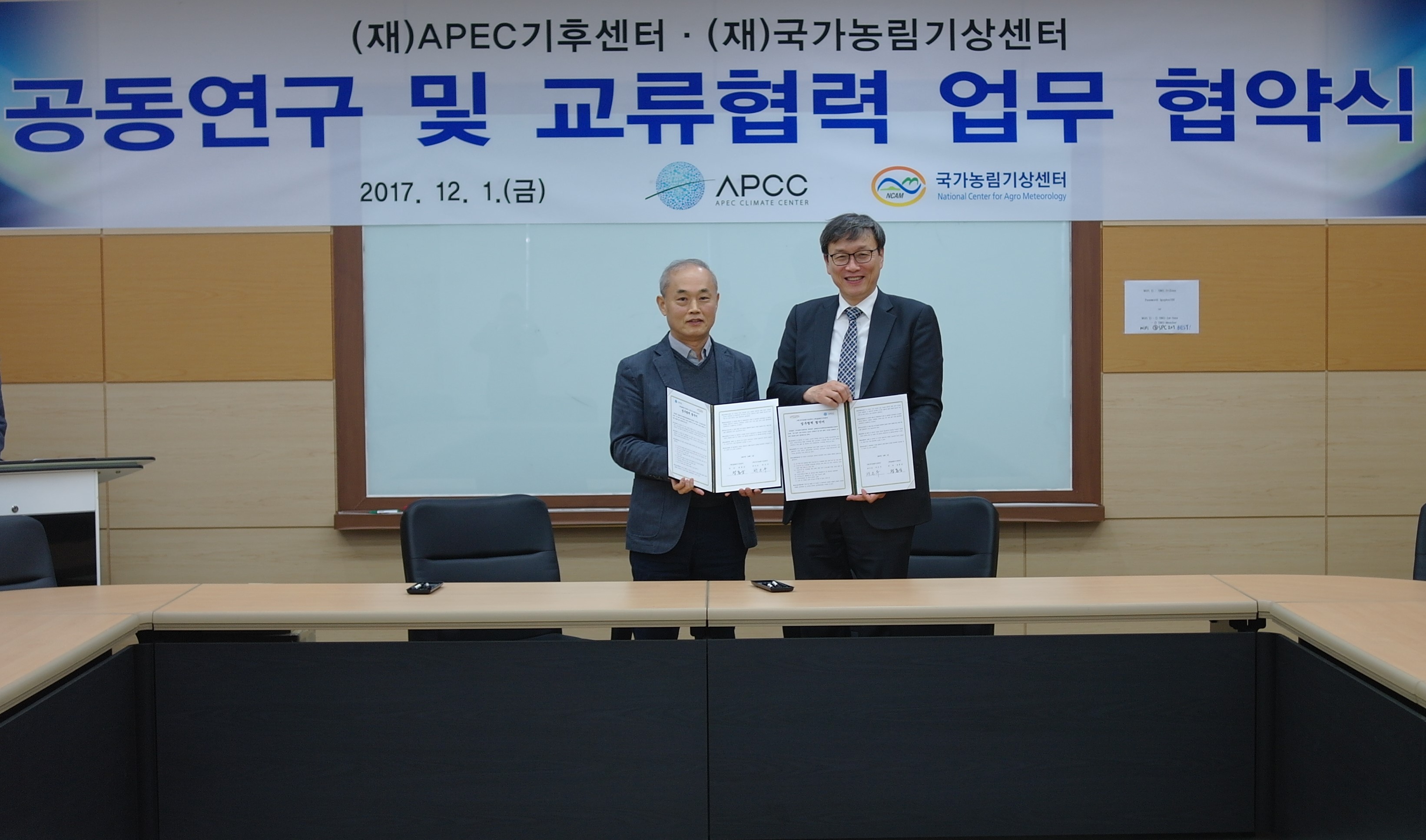APEC기후센터는 국가농림기상센터와 2017년 12월 1일(금) 서울대학교 내 국가농림기상센터에서 ‘농림업부문의 기후변화 대응 관련 연구협력을 위한 업무협약(MOU)’을 체결하였다.