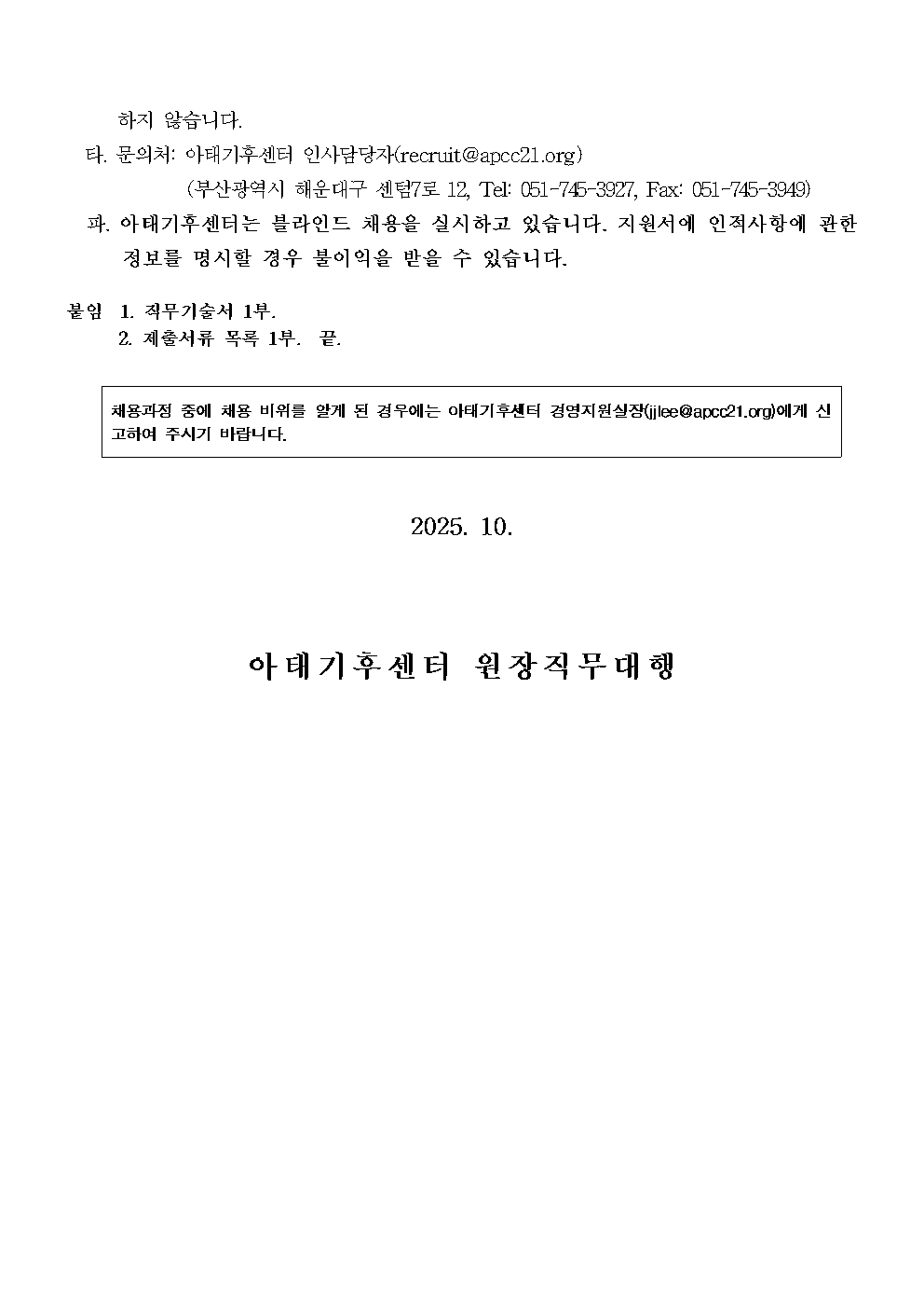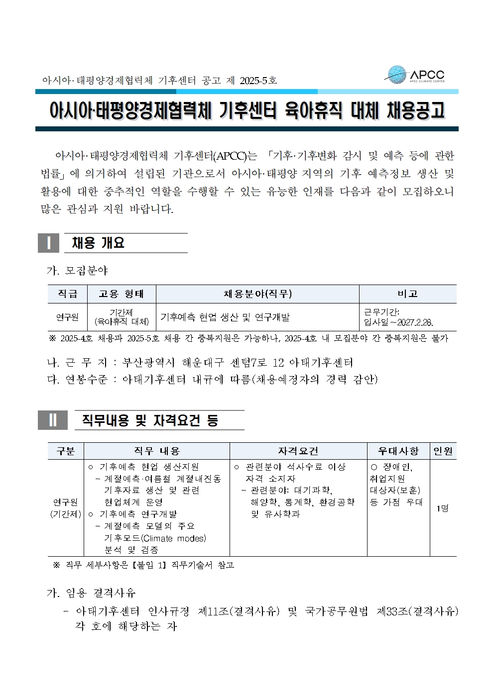 아시아·태평양경제협력체 기후센터 육아휴직 대체 채용 공고(2025-05)
