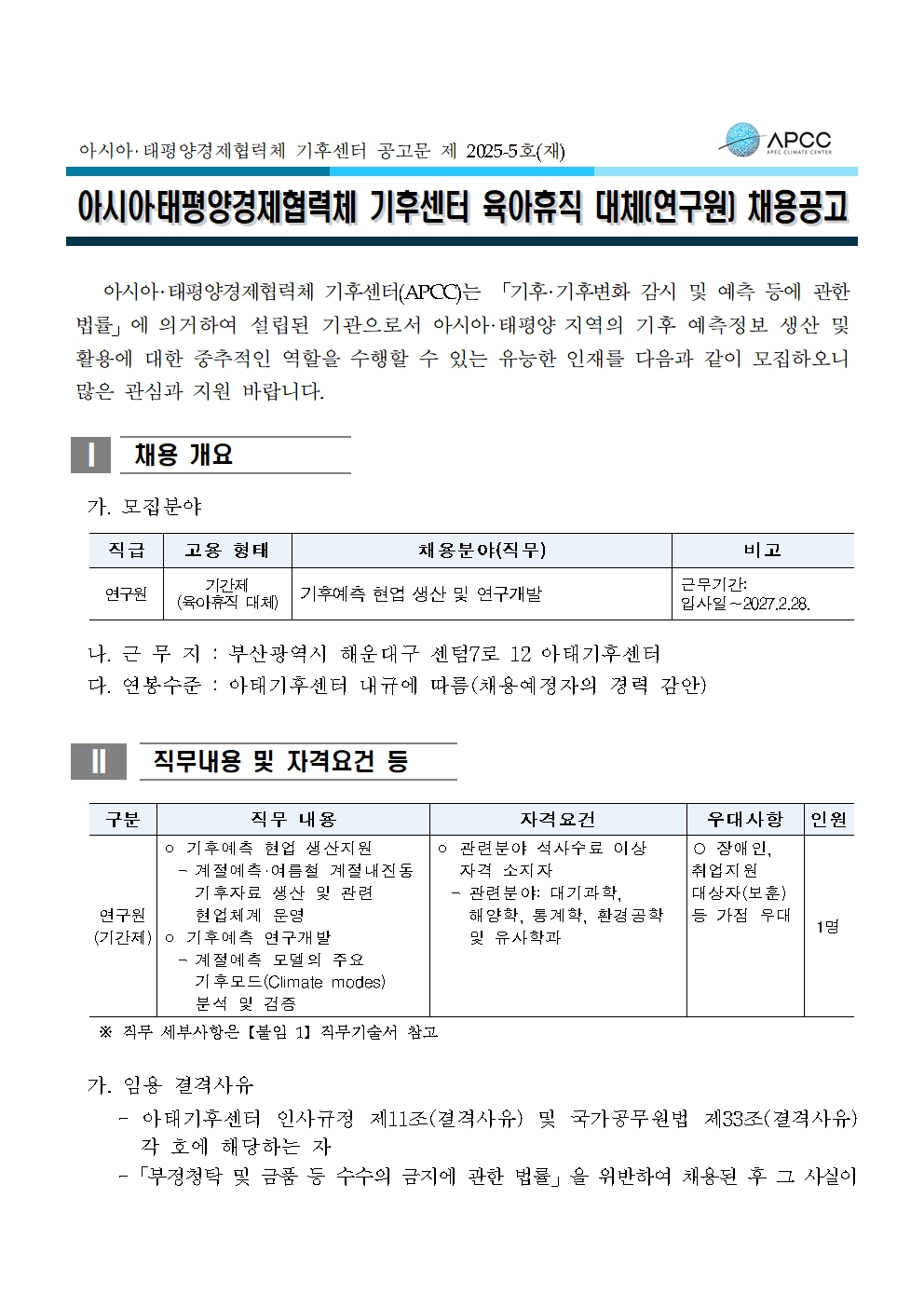 아시아·태평양경제협력체 기후센터 육아휴직 대체(연구원) 채용 재공고(2025-05)