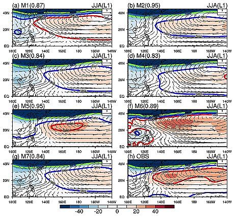 한편 APCC 연구팀은 동아시아의 여름철 강수 예측력을 높이기 위해 APCC 다중모델앙상블에 참여하는 기후예측모델 중 북서태평양고기압의 위치 및 최대 강도를 가장 잘 모의하는 우수 기후예측모델을 선별하였다. 이러한 우수 기후예측모델은 북서태평양고기압의 주요 위치 및 상태 변화를 실제 관측과 유사하게 모사(Simulation)할 수 있다는 것을 확인했다. 따라서 APCC 다중모델앙상블에 참여하는 모델 중 북서태평양고기압의 위치 및 상태의 변화를 실제의 관측과 가장 유사하게 나타내는 모델을 선별하였고, 주요 변동성을 3월경부터 예측할 경우, 북서태평양고기압의 변화 및 동아시아 여름철 강수 예측의 정확도 및 신뢰성을 높일 수 있다.