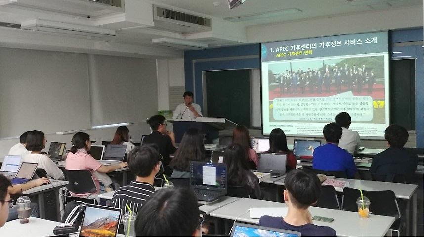 APEC 기후센터(APCC) 예측운영팀 한정민 박사는 지난 2018년 7월 23일 한국데이터진흥원에서 청년인재 일자리 연계 빅데이터 인재 양성 프로그램의 일환으로 부산대학교에서 진행하는 하둡 기반 빅데이터 분석·처리 과정에 참여한 교육생을 대상으로 ‘기후분야에서의 빅데이터 활용’이라는 주제로 특별 강의를 하였다.