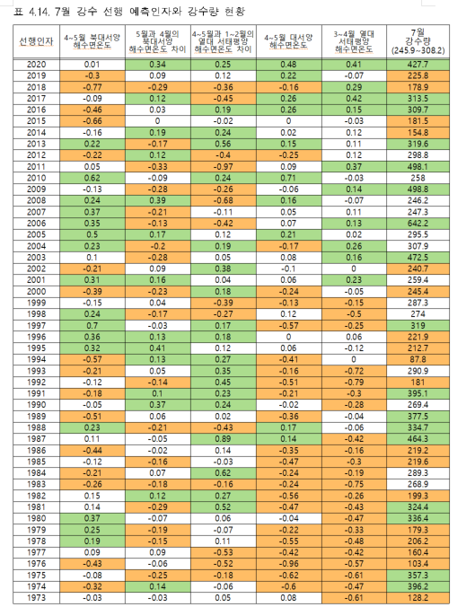 또한 실질적으로 현업 장기예보에 활용되는 우리나라 기후에 대한 기초 통계 자료가 체계적으로 정리되어 업무에 효율성을 높일 수 있도록 구성되었다. 예를 들면, 기후 예측 인자들의 상관계수 값만을 나타내는 것이 아니라 인자의 연도별 현황이 제시되게 함으로써, 예측 인자에 대한 신뢰도를 판단하기 쉽게 하였다. 또한 이미 개발되어 사용 중인 통계 예측 모형들의 최근 기간의 예측성에 대한 검증 결과를 제시하여 객관적 예보 생산에 활용할 수 있도록 하였다. 그뿐만 아니라, 최근 빈번하게 나 타나는 이상기후 현상은 신뢰도 높은 장기예보 생산을 어렵게 하는데 2018년 폭염이나 2020년 강수와 같은 최근 이상기후 사례의 물리적 메커니즘을 제시되게 함으로써, 최근 기후 변동 특성에 대한 이해도를 높일 수 있게 하였다.