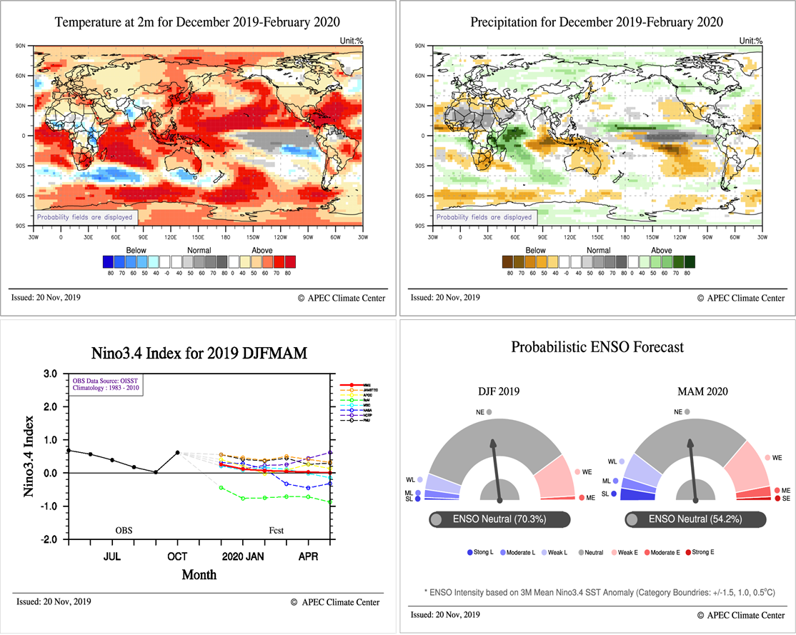 APEC기후센터는 국내와 전 세계에 제공해오고 있는 전세계 및 동아시아의 6개월 장기기후예측정보(기후전망)를 2019년 11월부터 기존 매월 25일에 제공해오던 것을 앞당겨 매월 20일에 제공한다.