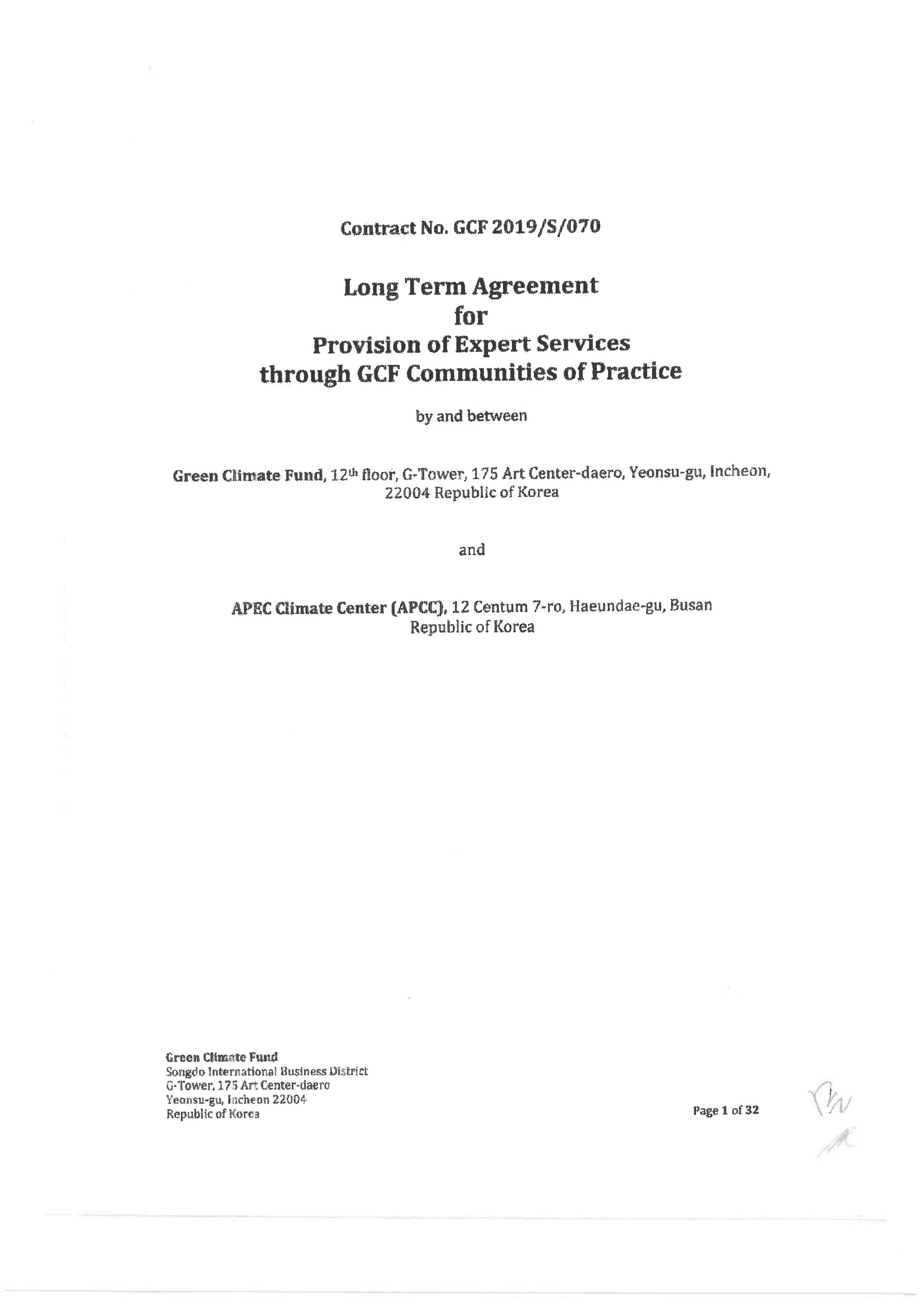 APEC기후센터(이하 APCC)는 유엔(UN) 산하 녹색기후기금(GCF)과 ‘녹색기후기금 사업에 기후분야 전문성·지식 제공 서비스를 위한 협력 계약(계약기간 2019년 11월부터 2년)’을 서면으로 체결하였다.