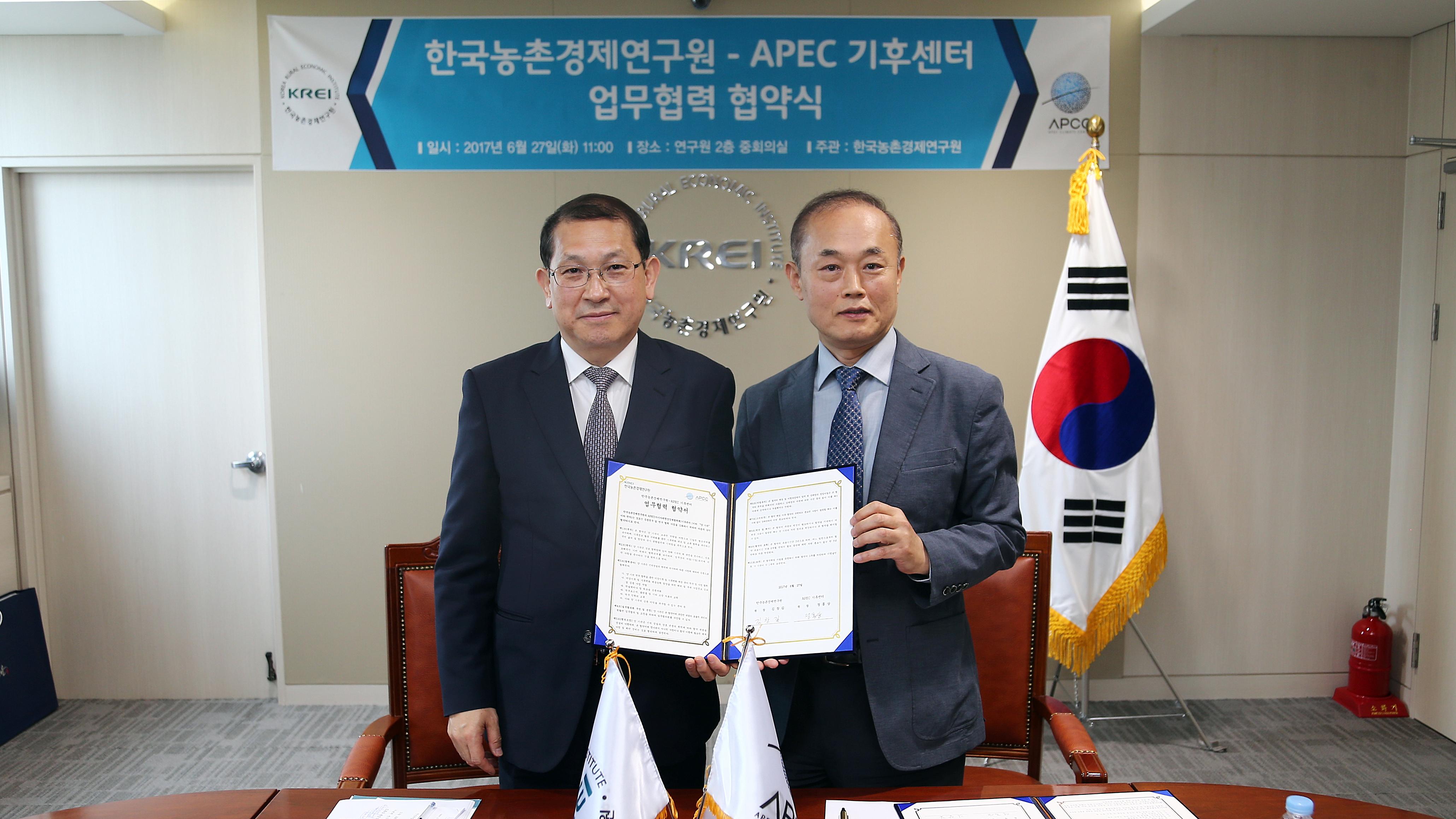 APEC기후센터(원장 정홍상, APCC)는 한국농촌경제연구원(원장 김창길, KREI)과 2017년 6월 27일(화) 전라남도 나주에 있는 한국농촌경제연구원 본관에서 ‘농림업의 기후변화 대응 관련 연구협력을 위한 업무협약(MOU)’을 체결하였다.