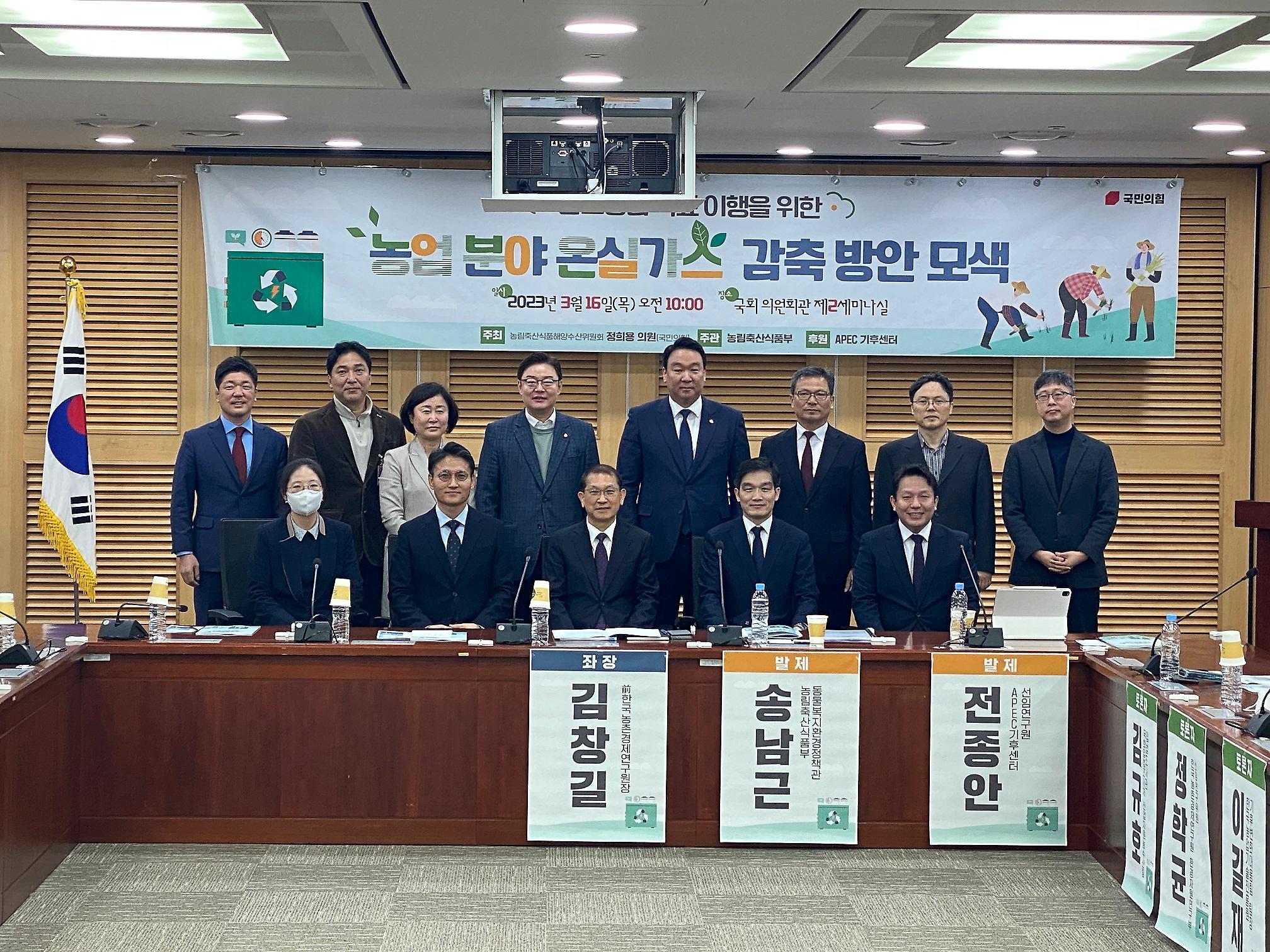 APEC기후센터(APCC) 전종안 선임연구원은 지난 2023년 3월 16일 국회의원회관 제2세미나실에서 열린 농업 분야 탄소중립 목표 이행 방안 모색을 위한 국회 토론회(주최 정희용 국회의원실, 주관 농림축산식품부, 후원 APEC기후센터)에서 ‘세계 농업분야 탄소중립 이행현황’을 주제로 발표했다.