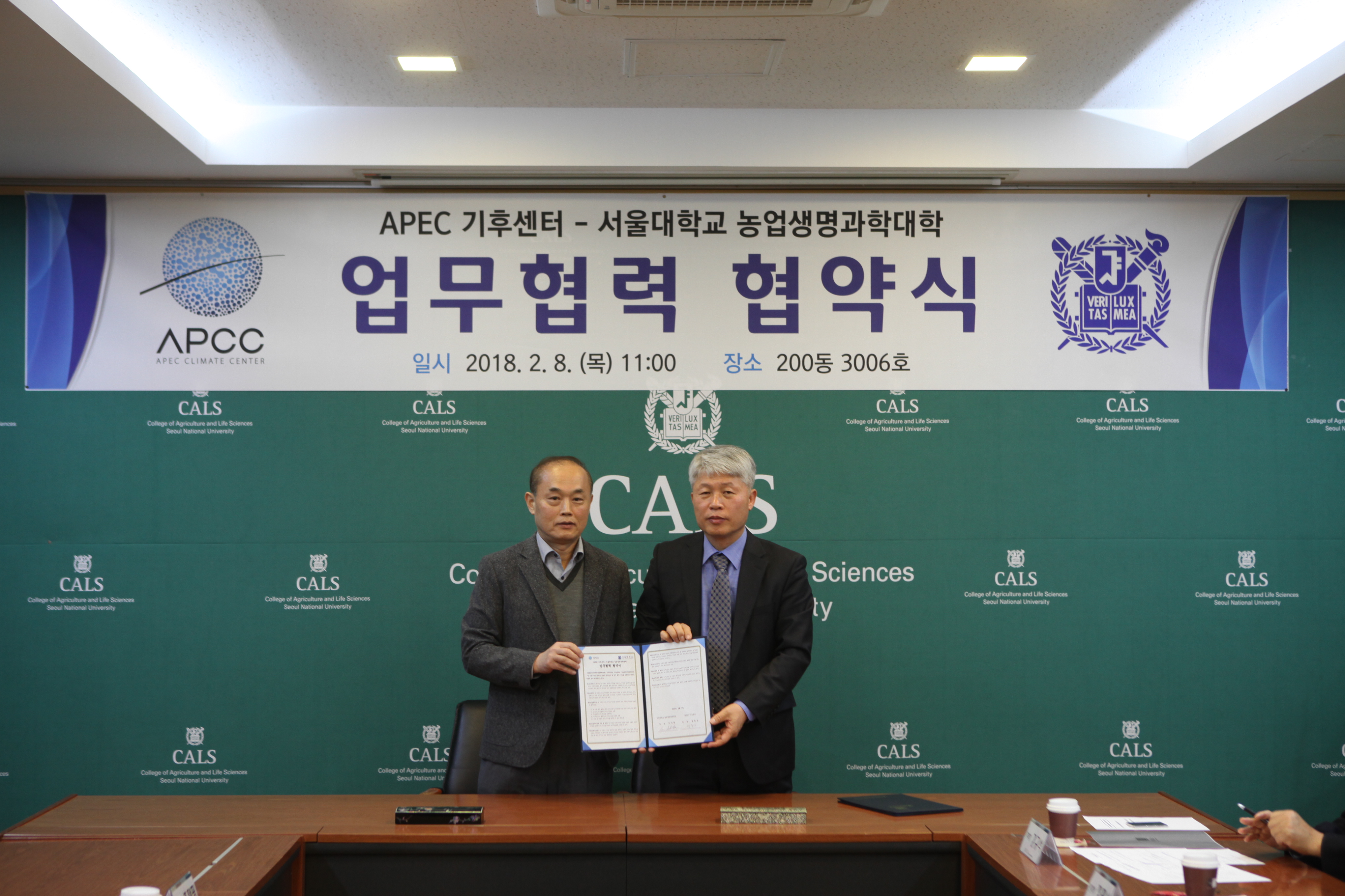 APEC기후센터(APCC)는 서울대학교 농업생명과학대학과 2018년 2월 8일(목) 서울대학교 관악캠퍼스에서 ‘기후정보를 활용한 농업부문의 기후변화 대응 위한 업무협약’을 체결하였다.